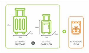 - 1 middelgrote koffer (67 × 48 × 27 cm) OF 1 kleine handbagage (55 × 40 × 25 cm)